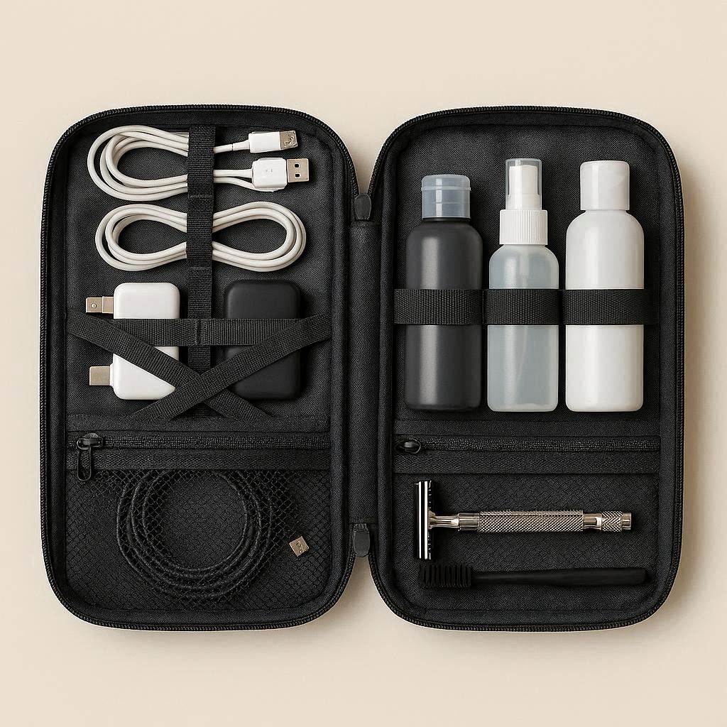 This innovative bag bridges the gap between tech and toiletries. One side features padded slots for a power bank, cables, and adapters, while the other has leak-proof compartments for grooming essentials. Made from water-resistant, static-free fabric to protect electronics. A dedicated USB pass-through port allows you to charge devices while they??re stored. The ultimate all-in-one organizer for remote workers and long-haul travelers.