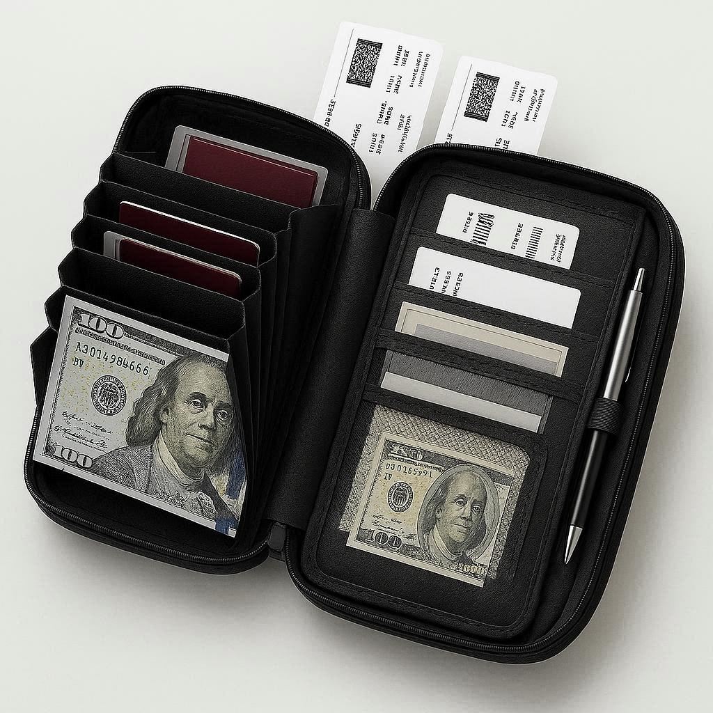 This innovative holder expands to accommodate extra documents. Features RFID-blocking technology and multiple compartments. Made from scratch-resistant material with a secure zipper. Ideal for travelers with extensive paperwork.