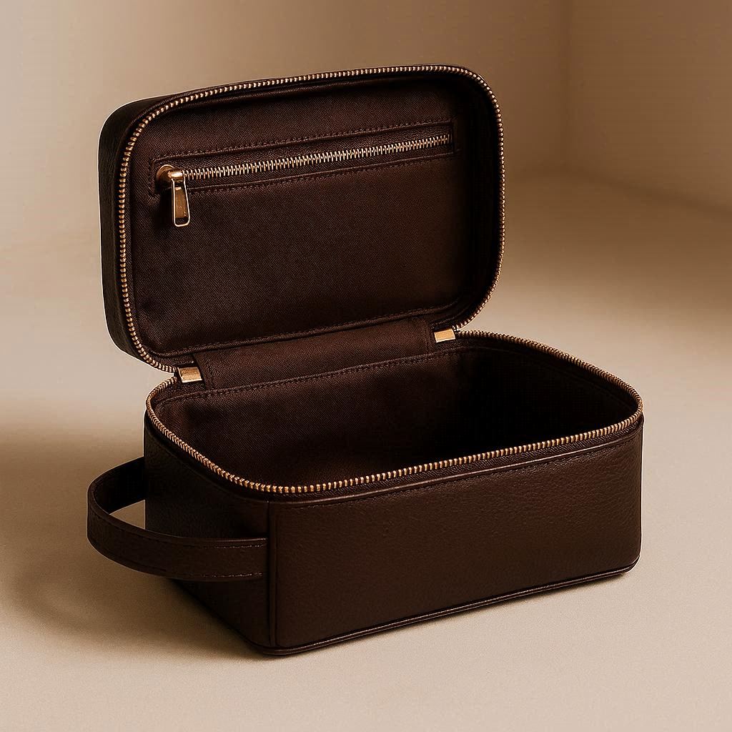 This toiletry bag offers a masculine, structured silhouette crafted from durable waxed canvas or technical polyester. It opens wide to reveal intelligent organization: a removable hard-case for clippers/trimmers, elastic loops for grooming tools, and a separate zippered compartment for liquids. The design is sleek, avoids bulk, and features premium metal hardware. Ideal for the modern man who values both style and practical utility in his grooming routine.